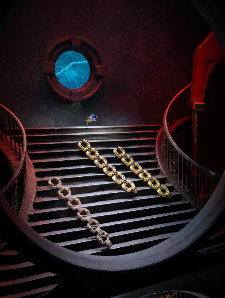 影片中共展示了27件蒂芙尼珠宝与器物,涵盖项链、手镯、戒指、耳环、胸针、吊坠、纯银制品、发梳及怀表等品类。其中有10件为具有历史意义的珠宝作品、6件为蒂芙尼古董珍藏库的银器作品、6件为当代珠宝佳作,以及5件专为该片量身打造的原创珠宝作品。片中几乎所有珠宝均由米娅·高斯佩戴演绎,而查尔斯·丹斯(Charles Dance)饰演的利奥波德·弗兰肯斯坦(Leopold Frankenstein)则佩戴一枚怀表亮相。