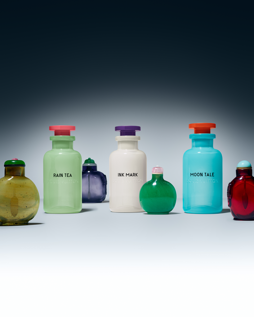 该系列香水中,由Marc Newson设计的经典路易威登香水瓶见证了现代设计与中国传统的邂逅。其造型从复古调香瓶汲取灵感,并向中国鼻烟壶致意。作为曾用于盛放鼻烟的小巧容器,鼻烟壶最终逐渐演变为艺术珍品。顶部的壶盖常以玉石、石英、母贝等珍贵材质打造,令其集优雅、实用与尊贵气息于一身,美轮美奂,可轻巧滑入丝绸囊袋。路易威登致敬这一精妙的艺术形式的同时,秉承了路易威登对美感与功用兼修的臻物的追求。从流光溢彩的北京琉璃工艺采撷灵感,香水瓶身绽现乳光,并以三种生动色调凝聚光华。较深的鲜艳漆面瓶盖形成互衬,呼应昔日点缀皇室鼻烟壶的半宝石。双色瓶装设计既可捕捉光影,又颇具神秘感,营造出充满张力的灵动美感。每款香水瓶均一一衬托对应香氛的独特韵调,系列配饰也不忘彰显对细节的精益求精:Monogram Ébène丝绸褶饰旅行收纳袋,配有启发自中国传统平安结的手工系扎皮环,意在延续礼尚往来之间纳福迎祥的寓意。实用之外,精致非常,亦体现出路易威登的旅行精神。为给这场品香之旅锦上添花,该系列还推出了内含三支迷你香氛的巧致套装,专为爱香藏家而设计。