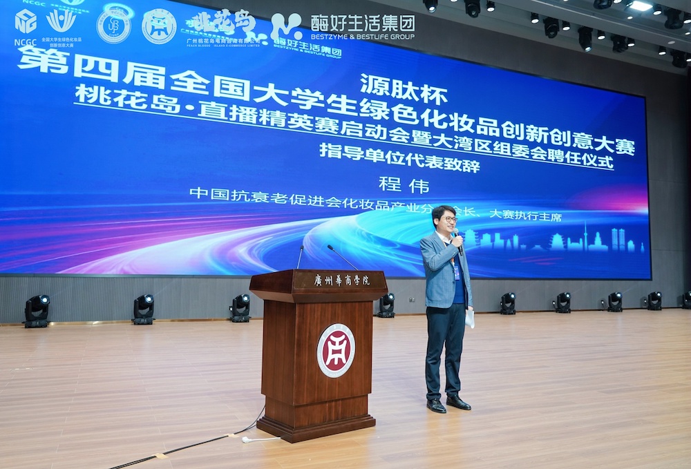 作为赛事指导单位代表,中国化妆品科学杂志社社长、中国抗衰老促进会化妆品产业分会会长、NCGC大赛执行主席程伟在致辞中回顾了赛事的成长历程。他指出,NCGC大赛已成功举办三届,参与规模实现跨越式增长——从首届 35所高校、305支团队,发展至第三届142所高校、1320支团队、超万名学生参与。“本届赛事全新推出的‘桃花岛直播精英赛’,是‘绿色低碳’与‘直播电商’的首次深度融合。” 程伟主席强调,当前直播电商正从 “低价竞争” 转向 “专业、真诚、可持续” 的新阶段,大赛通过真实市场场景搭建,鼓励学生用年轻化语言、数据化工具,将绿色科技转化为消费者认可的品牌故事。在 “颜值消费” 与 “双碳目标” 交汇的背景下,他呼吁汇聚高校科研、企业产业、政府政策与平台流量优势,构建协同创新的绿色生态,助力青年人才从校园走向国际舞台。