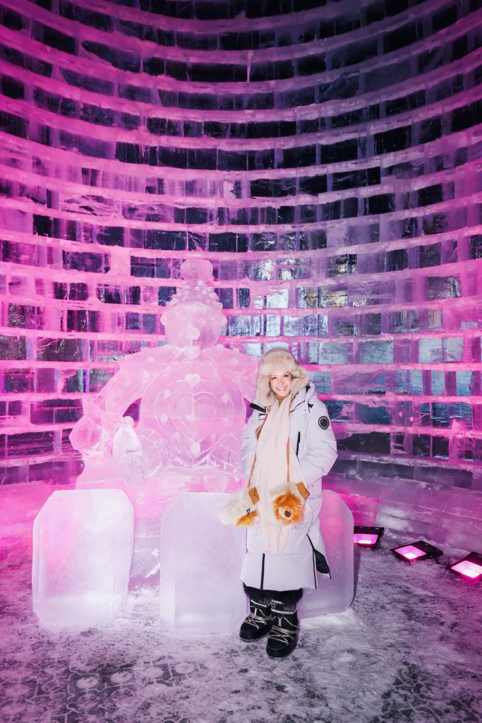 冰雕入口处,以Chopard萧邦经典的Happy Clown系列为灵感打造的“小丑”冰雕置身梦幻景致之间。作为Chopard萧邦联合总裁兼艺术总监卡罗琳·舍费尔(Caroline Scheufele)创作的首件珠宝及品牌珠宝的开山之作,这一承载其无尽创意的经典符号,如今于皑皑冰雪中焕发新生,以灵动姿态传递着悦然无拘的“乐享生活”理念。步入冰雕之内,另一尊“小丑”冰雕于光影深处温暖相迎,其胸前勾勒精致爱心轮廓,以妙然童趣点亮冬日愉悦光景与新年希冀。