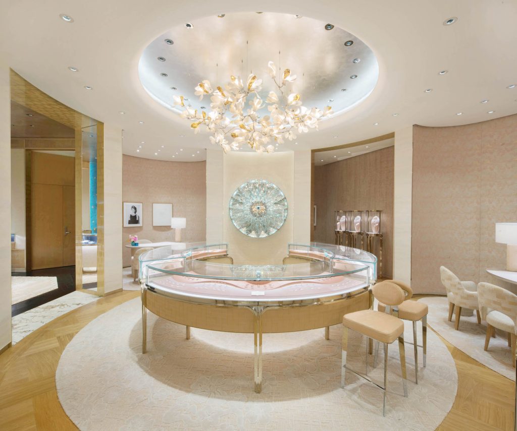 店内亦设有贵宾休息室,旨在带来更为舒适静谧的购物体验。私享空间饰以精致粉色兰花壁纸,礼赞蒂芙尼与自然世界的深厚联结。