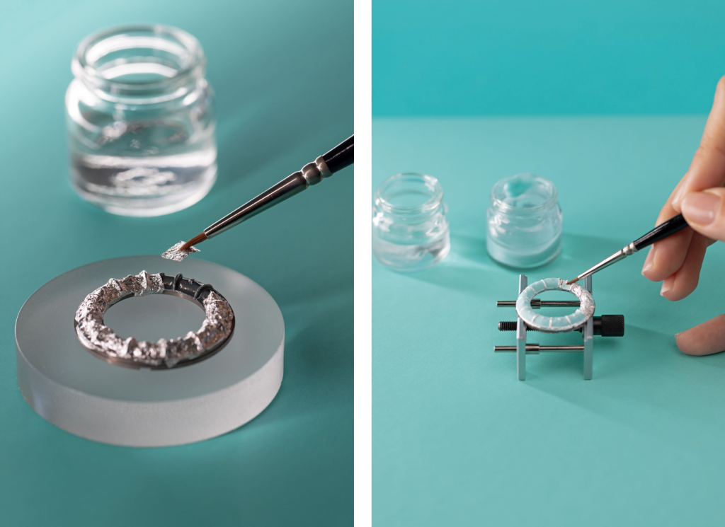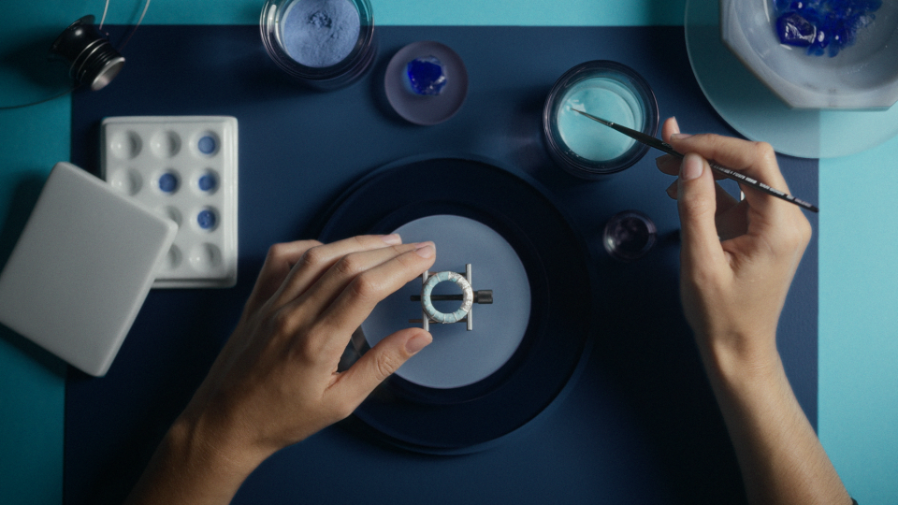 旋转外圈的制作工序繁复而严苛,整体耗时长达65小时——55小时用于珐琅制作工序,10小时则用于打造和镶嵌18K黄金织纹图案。对于每一枚采用蒂芙尼蓝配色的外圈,金属薄片嵌饰珐琅工艺的三道核心工序,即铺设金箔或银箔、施涂珐琅与高温烧制,需反复操作三次,才能最终呈现充满浓郁层次感和耀目光泽的色调。