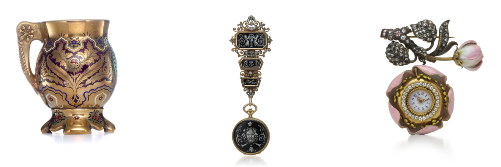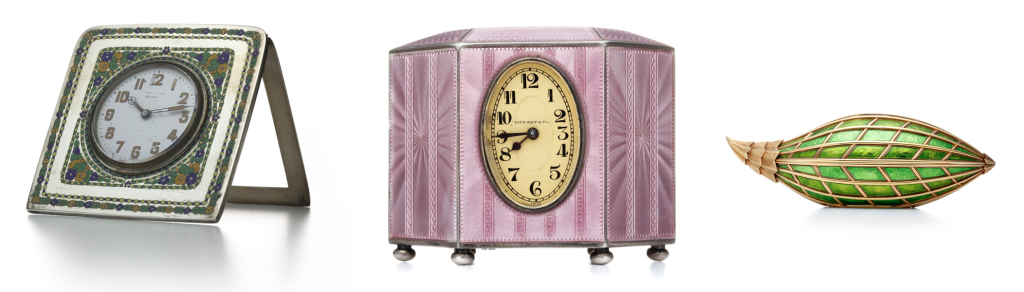 蒂芙尼的珐琅工艺传承可追溯至19世纪70年代。1878年,品牌在巴黎世界博览会(Exposition Universelle)首次展出了其自主打造的珐琅作品——一套精美的甜点器皿。在蒂芙尼工坊内,珐琅工匠与珠宝工匠、金匠及银匠并肩协作。他们熟练掌握包括掐丝珐琅(cloisonné)、精雕透明珐琅(flinqué)和墨彩珐琅(grisaille)在内的多种珐琅技法,并将其广泛应用于花瓶、胸针、时钟及腕表等各类作品的装饰。蒂芙尼古董珍藏库中保存着众多惊艳绝伦的珐琅作品,包括19世纪末以珐琅和珍贵宝石打造的一系列腰链表与胸针表,1889年问世的一款备受赞誉的苹果花胸针表,以及一组创作于20世纪20年代的装饰艺术风格座钟。1962年,让·史隆伯杰将几乎被遗忘的金属薄片嵌饰珐琅工艺重新引入高级珠宝世界。他所创作的珐琅杰作色彩鲜艳,令人过目难忘,成为了20世纪珠宝设计的典范。