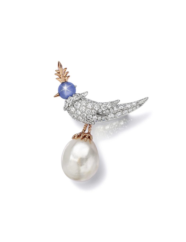 蒂芙尼让·史隆伯杰高级珠宝系列“珍珠石上鸟”胸针 以星光蓝宝石作为鸟首