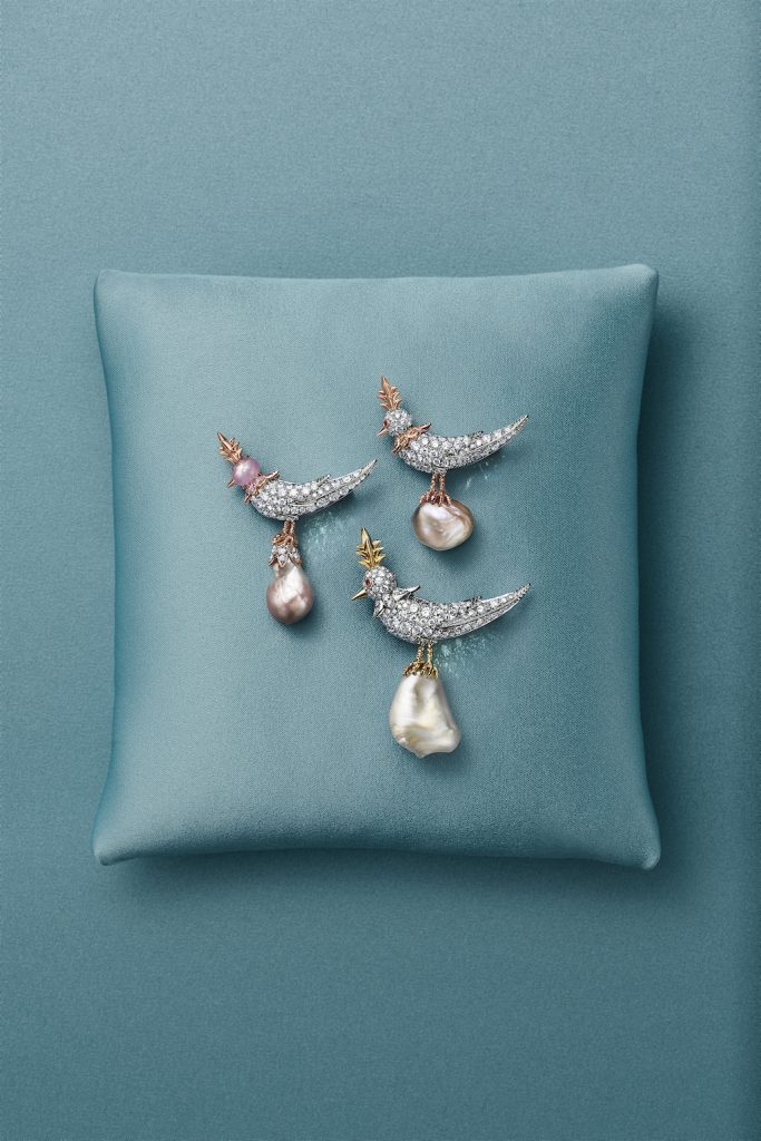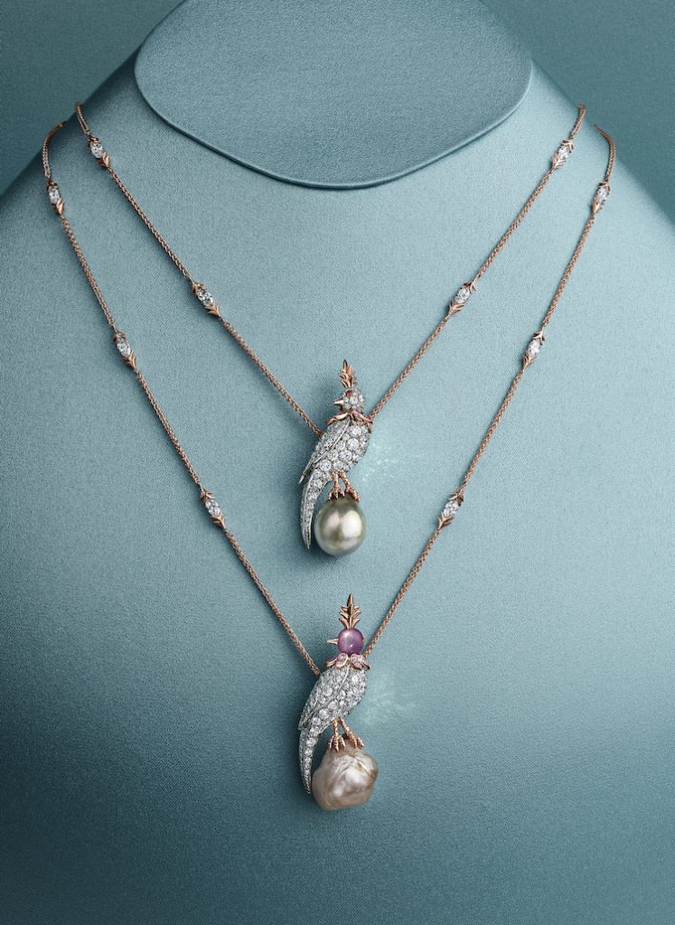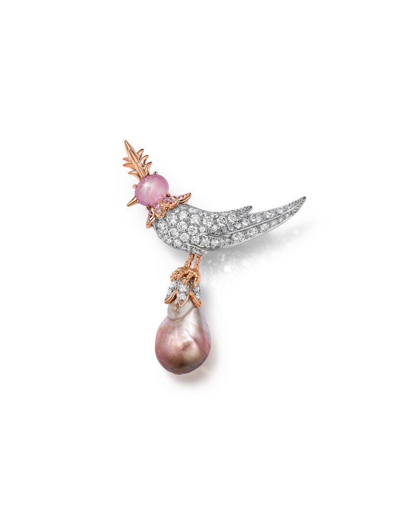 全新系列中,每一颗珍珠皆以卓然出众的色彩、形状与光泽,成为“珍珠石上鸟”创意表达的灵感基石。2026全新作品更引入瞩目的创新设计——星光蓝宝石鸟首。经由品牌精心甄选,星光蓝宝石不仅拥有独特的色调,更呈现出宛若星辰闪耀的星芒效应。部分作品中,它们与珍稀彩色钻石彼此映衬,精妙融入小鸟的轮廓之中。星光蓝宝石与珍珠的相互辉映,则营造出细腻而富有诗意的灵动之美,在精准工艺与艺术表达之间取得优雅平衡。其中一枚胸针以铺镶钻石勾勒小鸟造型,搭配星光蓝宝石头部,优雅伫立于一颗重逾18克拉的白色巴洛克天然野生珍珠之上。另一款同样引人瞩目的吊坠作品,则以一颗重逾29克拉的棕灰色巴洛克天然野生珍珠为视觉焦点,这是该系列甄选的体量最为硕大的珍珠之一。这些非凡之作共同印证了蒂芙尼一以贯之的匠心造诣与精湛技艺。