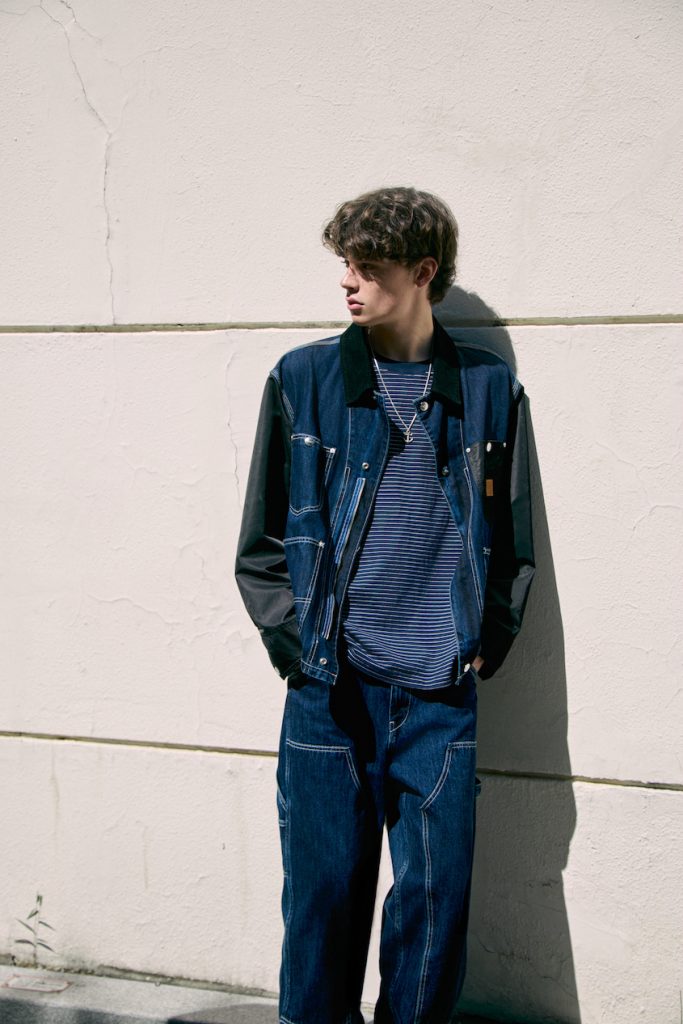 在延续工装实用骨架的基础上,通过混合材质、创新非丹宁面料,并重点运用品牌标志性立体Jelt Denim面料——该面料采用特殊高弹织造工艺,在保留传统丹宁粗粝质感与耐久特性的同时,显著提升面料的纵向弹力与肢体适配度,形成独特的立体肌理与动态贴合效果——以此实现经典结构的当代焕新。设计上聚焦于非常规细节重构,将传统功能部件转化为兼具装饰性与辨识度的现代设计语言,以此回应注重个性表达与穿着体验的当下市场,精准连接工装脉络与未来穿着形态。