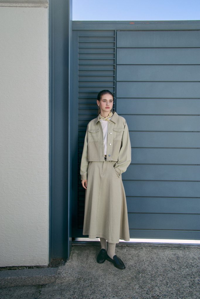 - 女款短版非牛仔工装夹克,利落短版剪裁重塑工装新韵,背幅品牌皮革标牌铭刻经典印记,同色系面料巧妙混搭,层次美学跃然眼前。搭配同系列女款工装A字裙,柔美与硬朗交织,都市造型中尽显女性摩登风范。