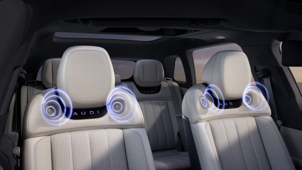 系统还配备超近场座舱扬声器——包括前排肩部扬声器和后排独立头枕扬声器。可为不同座位独立设置不同音量,让乘客在休息或娱乐时互不干扰。